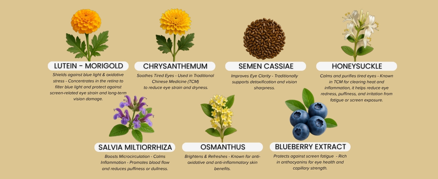 - 🌿 7 Functional Botanicals for Eye Renewal Formulated with Lutein, Chrysanthemum, Cassia Seed, Honeysuckle, Salvia miltiorrhiza, Osmanthus and Blueberry — a powerful blend to reduce puffiness, dryness, and eye fatigue while restoring clarity and comfort.